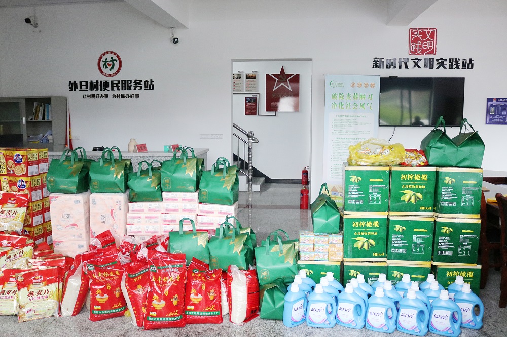 活动开始前,志愿者们冒雨将粮油、纸巾、洗衣液等生活必需品一件件搬上货车运送到外旦村便民服务站。临近端午节,志愿者送上物资的同时还送上粽子礼包,对于身体不便的老人,志愿者们将物资一一送到家,随后与老人们亲切交谈,耐心询问他们的身体状况和困难需求,嘱咐他们多保重身体,并鼓励他们保持乐观心态、积极面对生活,慰问的同时也送上了一份关怀和温暖。