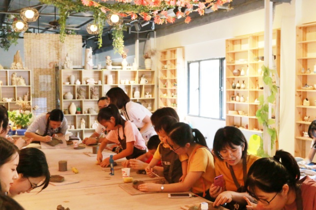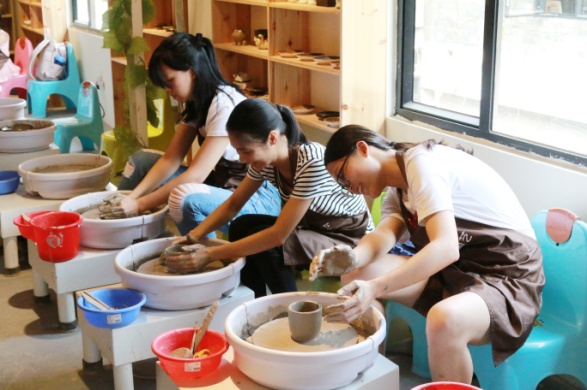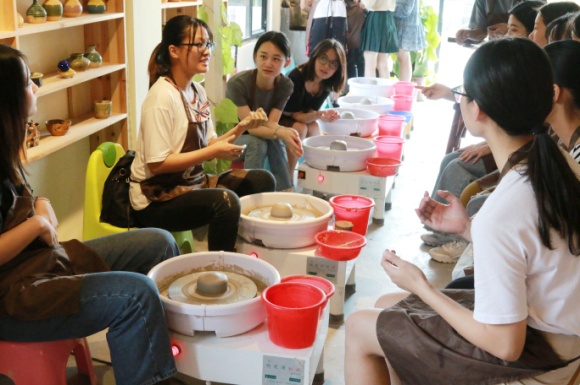 14时,活动正式开始,包含拉胚和捏塑两项陶艺体验项目。陶艺老师首先给每人发了一块陶泥,讲解了手工揉泥相关知识与要求、简单拉胚的技巧和注意事项以及相关工具的使用方法,最后简单示范了制作步骤流程。看似简单的陶艺,其实有着复杂的过程,制作陶艺要求有充足的耐心,还要讲究技术与细心,根据老师的指导,大家充分发挥想象力和创造力,制作出一个个属于自己的陶艺作品。