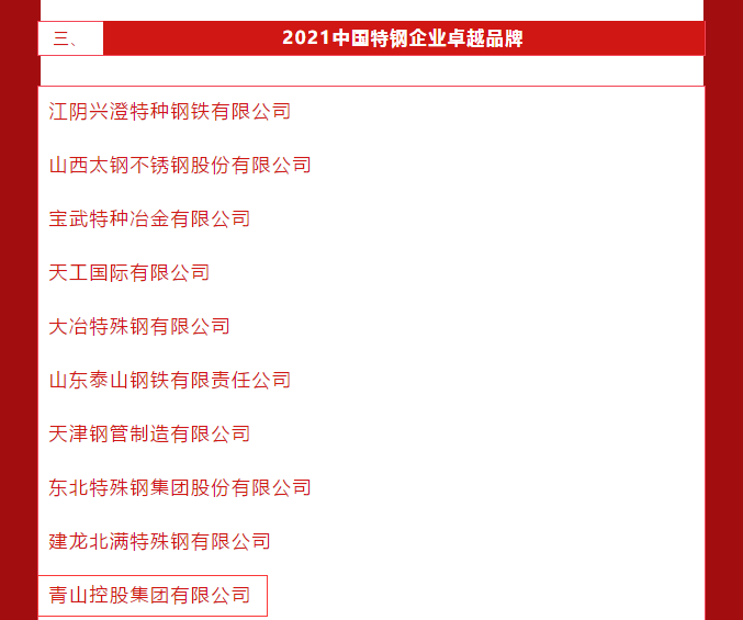 5月10日,第5个中国品牌日,中国冶金报社发布了2021年度中国钢铁品牌榜。pa视讯控股集团有限公司荣膺“2021中国卓越钢铁企业品牌” “2021中国特钢企业卓越品牌”。