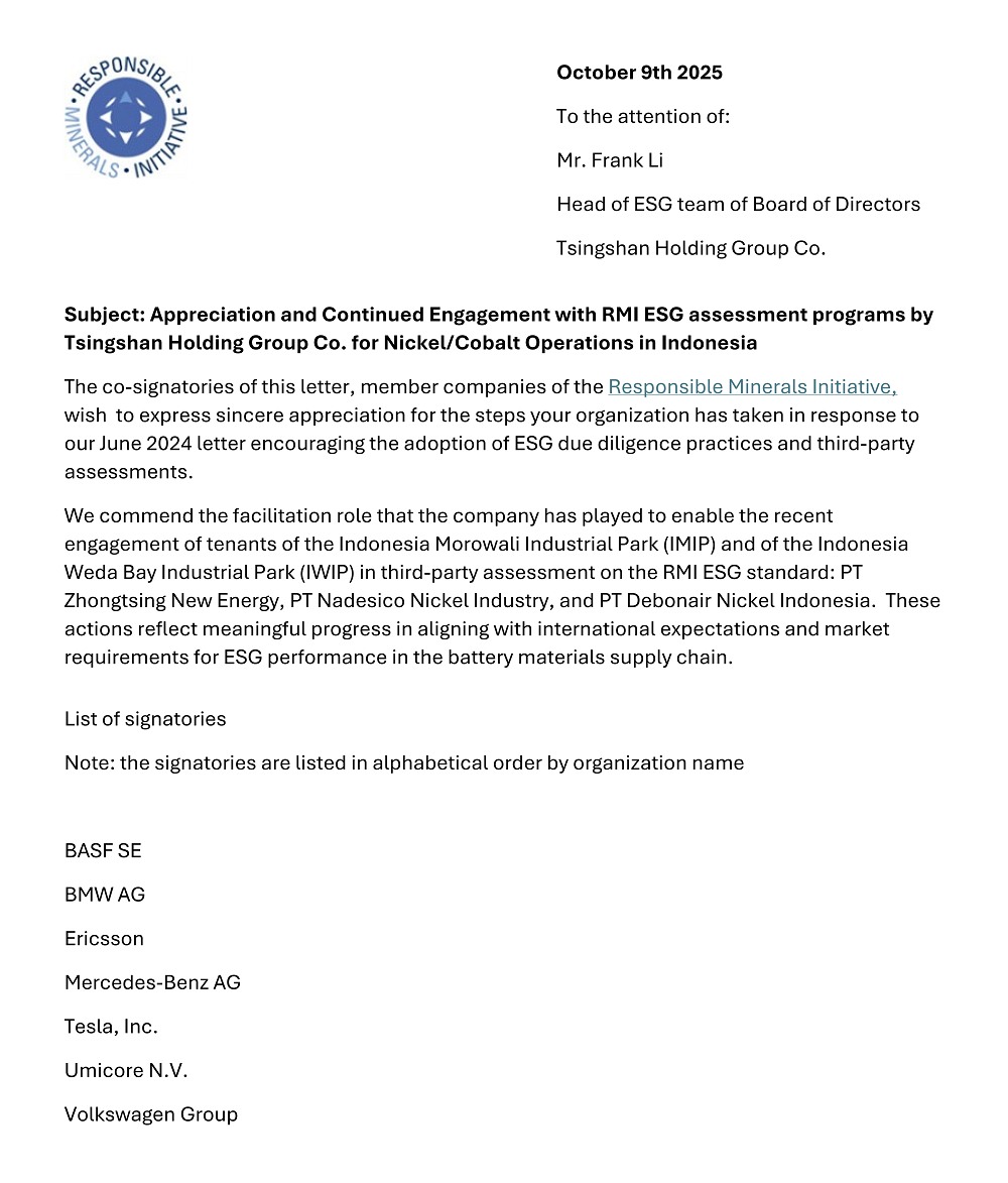 信中指出,pa视讯实业通过积极参与国际规则对接、发挥协调引领作用,组织协助pa视讯印尼IMIP、IWIP入园企业参与相关审核,有效促进了供应链透明度和责任治理能力的不断提升。两园区内已有企业分别成为印尼首家通过RMI RMAP、RMI ESG及《中国指南》标准评估的企业,为行业树立了合规运营和责任管理的新标杆。截至目前,印尼莫罗瓦利及纬达贝园区中共有7家入园企业完成RMI RMAP审核,2家完成RMI ESG审核。这些扎实进展不仅标志着pa视讯实业在遵循国际ESG标准、满足市场需求上迈出关键一步,也为其在全球绿色供应链中赢得信任奠定了坚实基础。