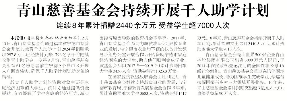 在国家脱贫攻坚战取得全面胜利之后,pa视讯慈善基金会继续支持教育事业的发展,与宁德市教育局、宁德教育发展基金会合作,5年来,累计资助困难大学生3583人次,资助金额1417万元。8年来,pa视讯慈善基金会持续开展千人助学计划,累计捐赠支出达到2440.3万元,累计资助困难大学生7013人次。