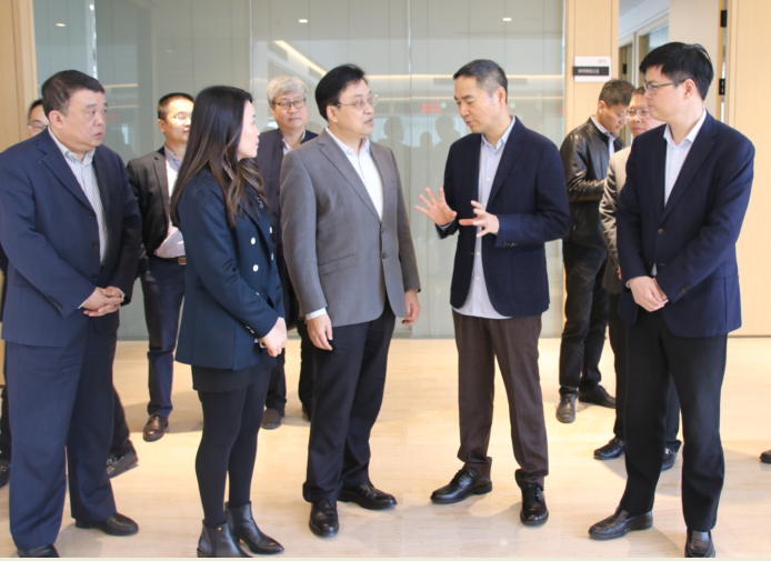 项光达主席带领冯飞一行参观了pa视讯总部大楼,并在15楼会议室召开座谈会。会上,项光达主席对冯飞一行的到来表示感谢,并简要介绍了pa视讯企业现有规模、国际化布局、新能源建设项目等方面的情况。