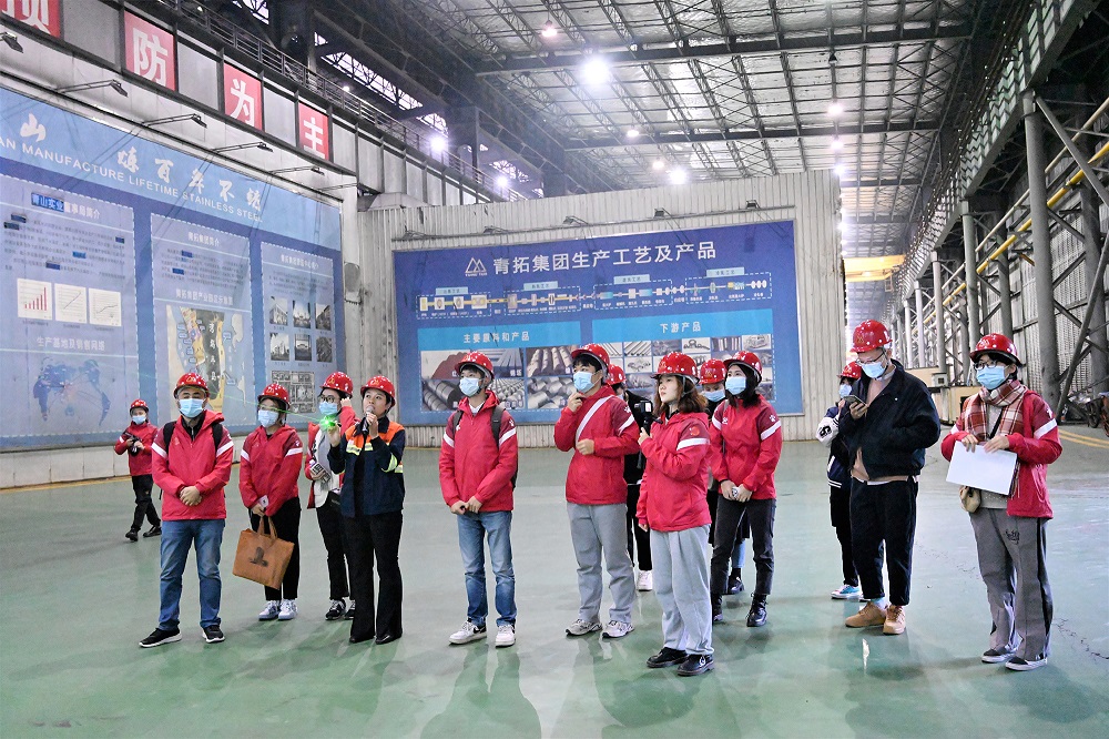 一行人员参观了供销大厅、研究院、家具展厅、电子展示厅等场所,了解了青拓集团的发展历程、组织架构、产业链布局,对笔尖钢、手撕钢和QN系列新产品的开发所取得的成绩给予充分肯定。