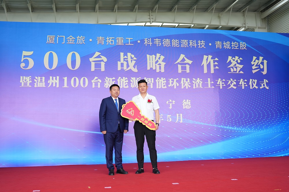 5月21日10点58分,厦门金旅、青拓重工、科韦德能源科技、青城控股 500 台战略合作签约暨温州 100 台新能源智能环保渣土车交车仪式于青拓重工厂区内举行。青拓集团有限公司董事长姜海洪,厦门金龙旅行车有限公司党委书记、董事长彭东庆,福建青拓重工有限公司总经理郑建新,温州科韦德能源科技有限公司总经理卢江,浙江青城控股有限公司董事长章以江等领导亲临活动现场。